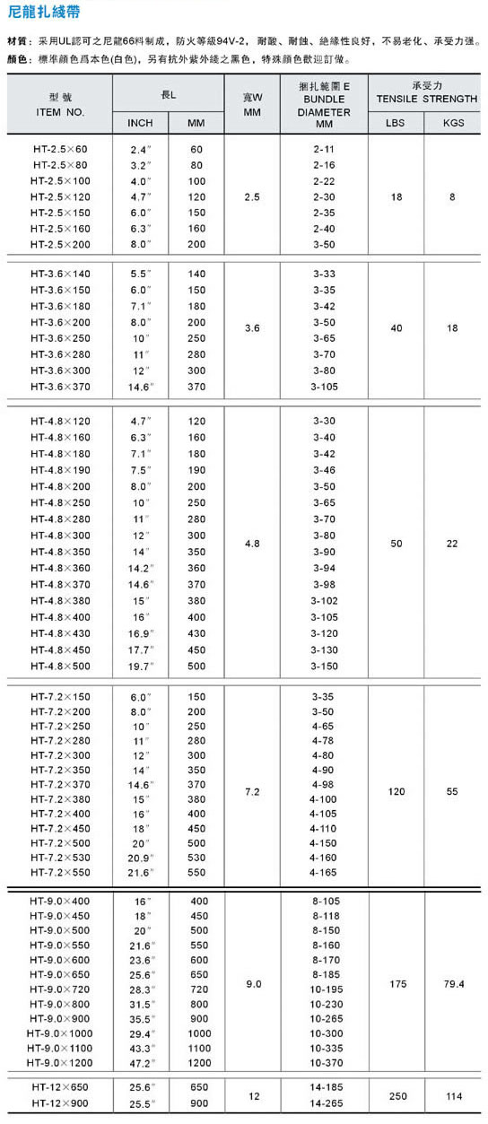 3、船用尼龍扎帶又稱不銹鋼嵌片扎帶采用尼龍66材料制成,具有絕緣性能好,難燃性,操作方便,省工省本等特點。 顏色:黑色、白色(本色)其他顏色可以定做。